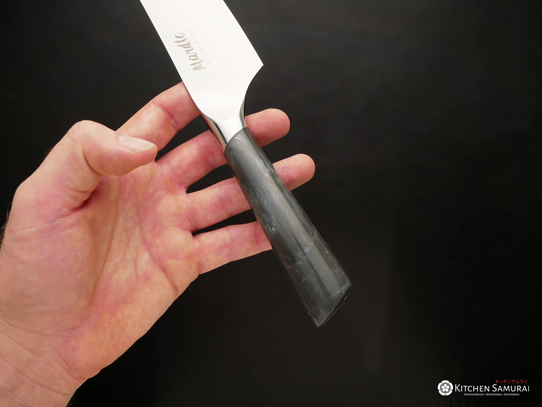 The Santoku thin blade is shorter than Western chef’s or Gyuto knives making it lighter, easier to handle and less strenuous for long periods of work. The flatter cutting edge is nearly straight from heel to tip. The Santoku is perfect for users with smaller hands and a bit more limited working space. The double-bevel, thin, sharp edge prioritises finesse instead of power.