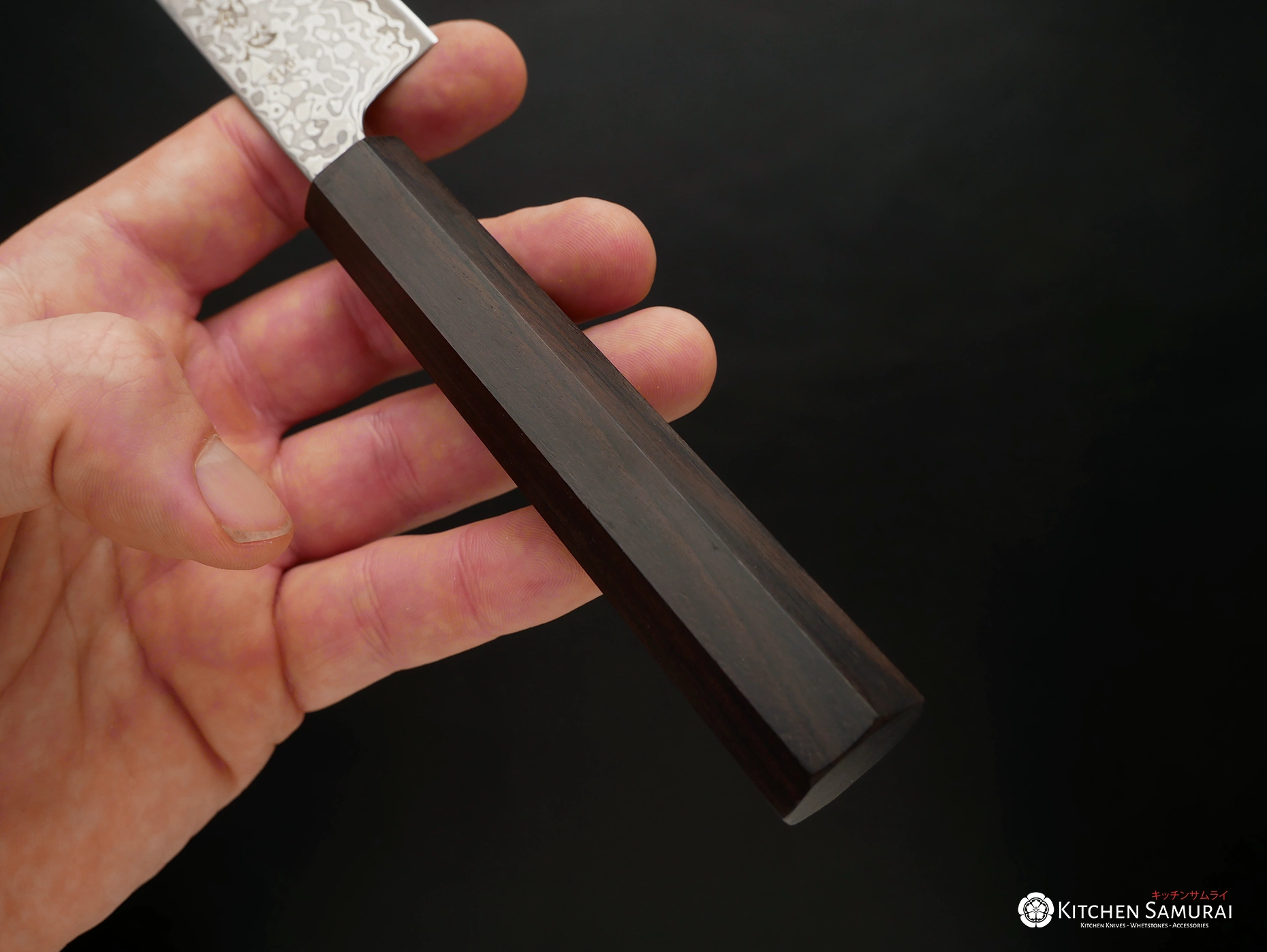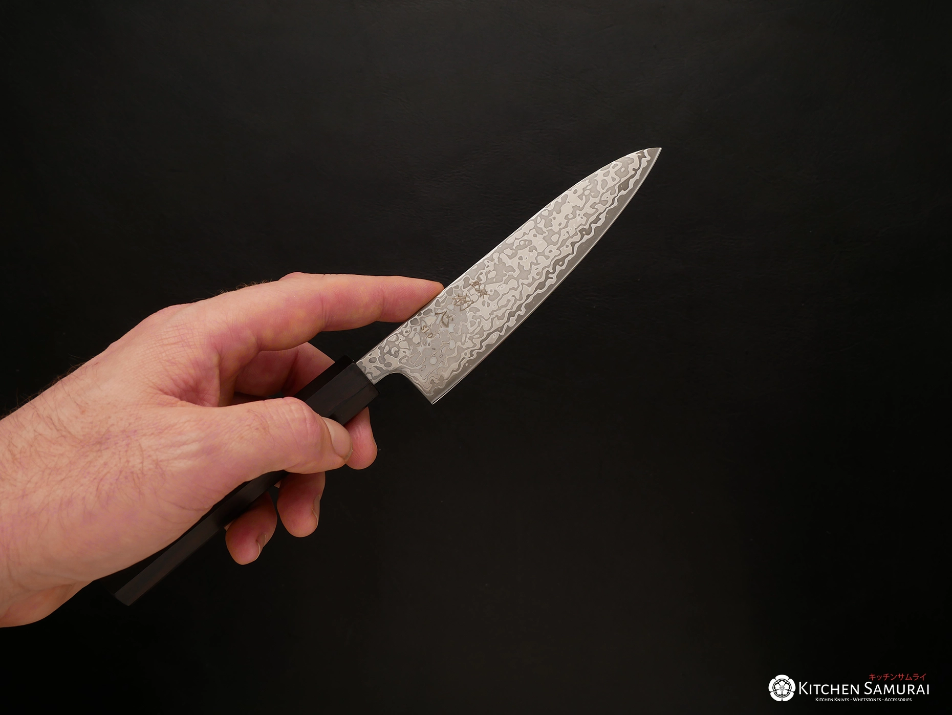 The petty knife is perfect for smaller working surfaces, cutting smaller sized produce if for users with smaller hands. Its comparison to the Gyuto makes it the ultimate small-sized all-rounder and professional cooks prefer it for its compact size and versatility. It can be used to peel, slice, dice, mince and trim a variety of smaller fruits, vegetables, herbs, garnishes and proteins. It is perfect for light butcher work and delicate tasks such as making precision cuts. The blade profile is well suited for thrust-cutting while the belly allows for rock-cutting.