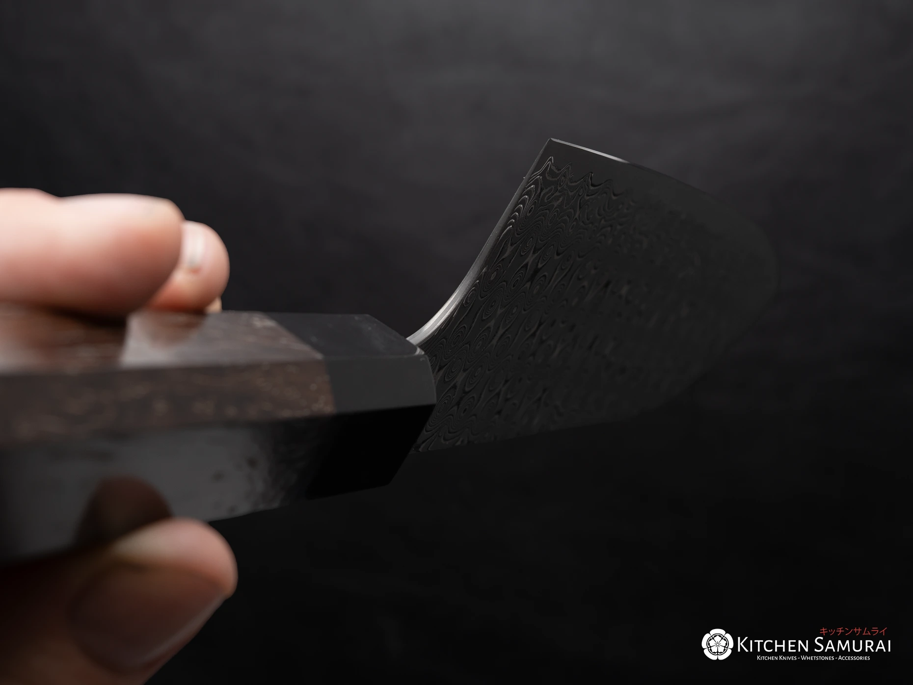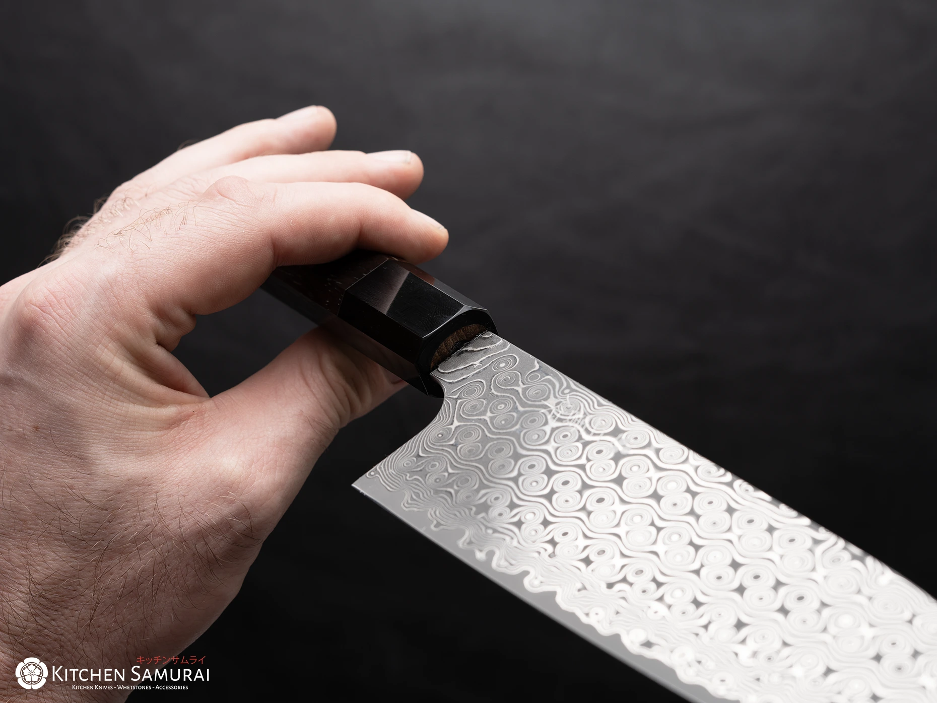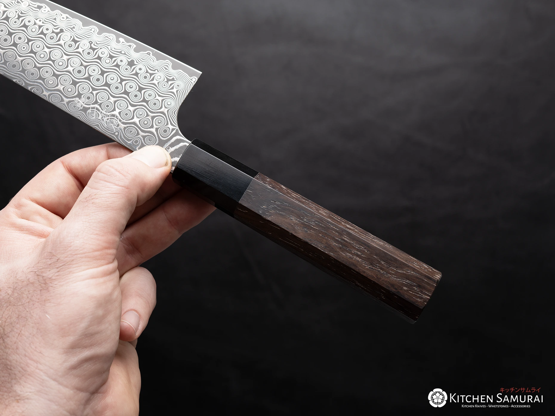 The Santoku thin blade is shorter than Western chef’s or Gyuto knives making it lighter, easier to handle and less strenuous for long periods of work. The flatter cutting edge is nearly straight from heel to tip. The Santoku is perfect for users with smaller hands and a bit more limited working space. The double-bevel, thin, sharp edge prioritises finesse instead of power.