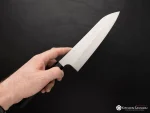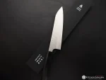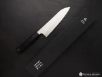 The Gyuto features a longer blade providing versatility for cutting larger produce while the tip of the blade allows it to be nimble enough for precision work. The edge is flat from the heel to the belly with a slightly rounded profile from the belly to the tip. The hard steel used in manufacturing makes the double-bevel edge much sharper than Western chef’s knives and retains the ultra-sharp edge for much longer.