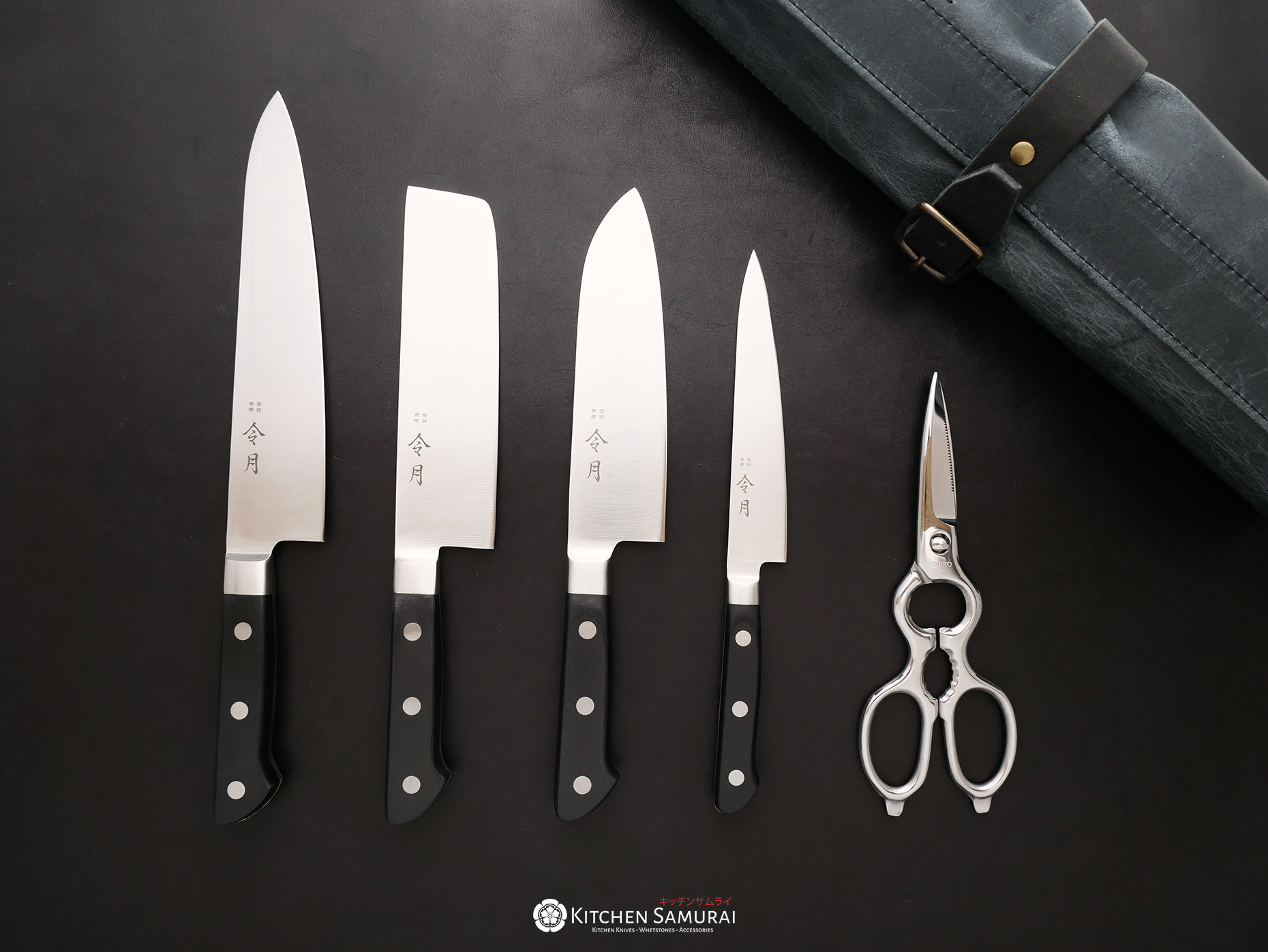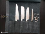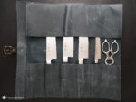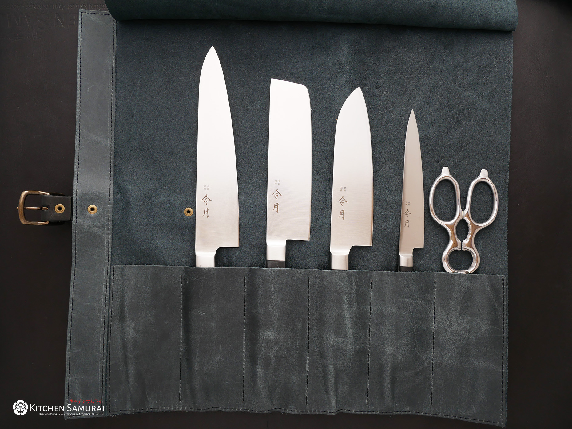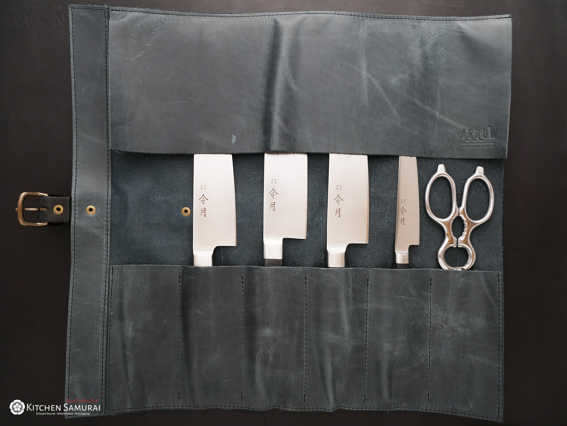 Reigetsu 4 Piece Knife Roll with Tojiro Shears and Blue Arrow Knife Roll