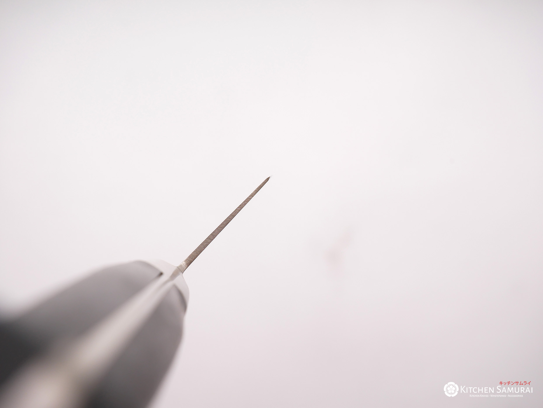 The Nakiri knife has a long, thin, and rectangular-shaped blade with a straight edge, and a flat, blunt tip. The Nakiri’s shape can be mistaken for a cleaver but be warned that it is not made for heavy-duty work like cutting bones or frozen foods. The thinness of the blade also ensures that delicate vegetables can be cleanly cut without ripping the skin, and helps to achieve crisp edges on each slice.