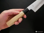 The Gyuto features a longer blade providing versatility for cutting larger produce while the tip of the blade allows it to be nimble enough for precision work. The edge is flat from the heel to the belly with a slightly rounded profile from the belly to the tip. The hard steel used in manufacturing makes the double-bevel edge much sharper than Western chef’s knives and retains the ultra-sharp edge for much longer.