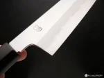 The knife is forged from Shirogami/White Carbon Steel. The Shirogami core steel is cladded in Soft Iron, which makes the entire blade of the knife reactive steel, so extra care and maintenance are critical. It’s always a good idea to wipe your blade with a damp towel while working, especially with highly acidic foods like onion, lemons, etc., until a patina has developed on the blade.