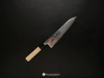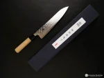 The Gyuto features a longer blade providing versatility for cutting larger produce while the tip of the blade allows it to be nimble enough for precision work. The edge is flat from the heel to the belly with a slightly rounded profile from the belly to the tip. The hard steel used in manufacturing makes the double-bevel edge much sharper than Western chef’s knives and retains the ultra-sharp edge for much longer.