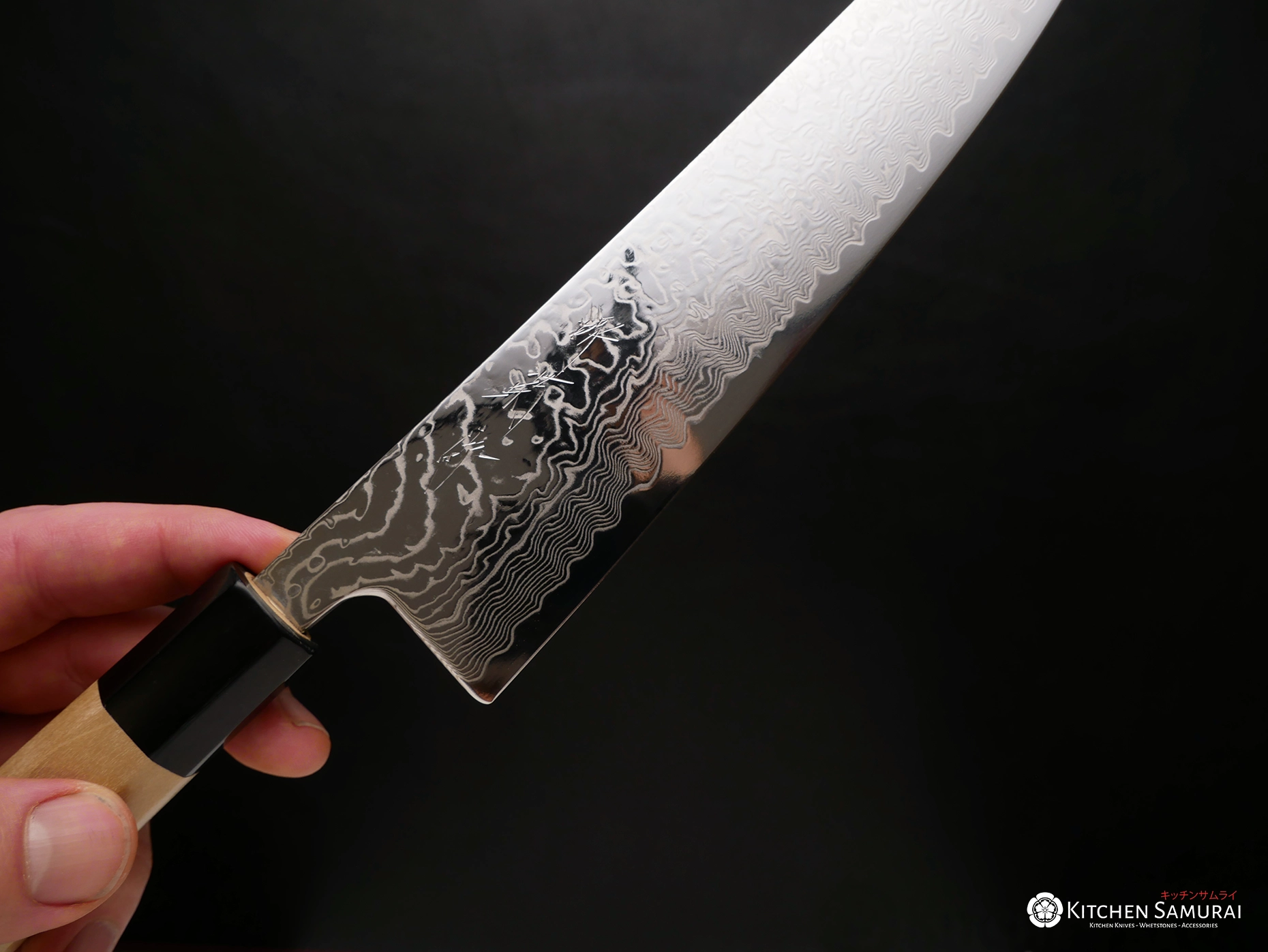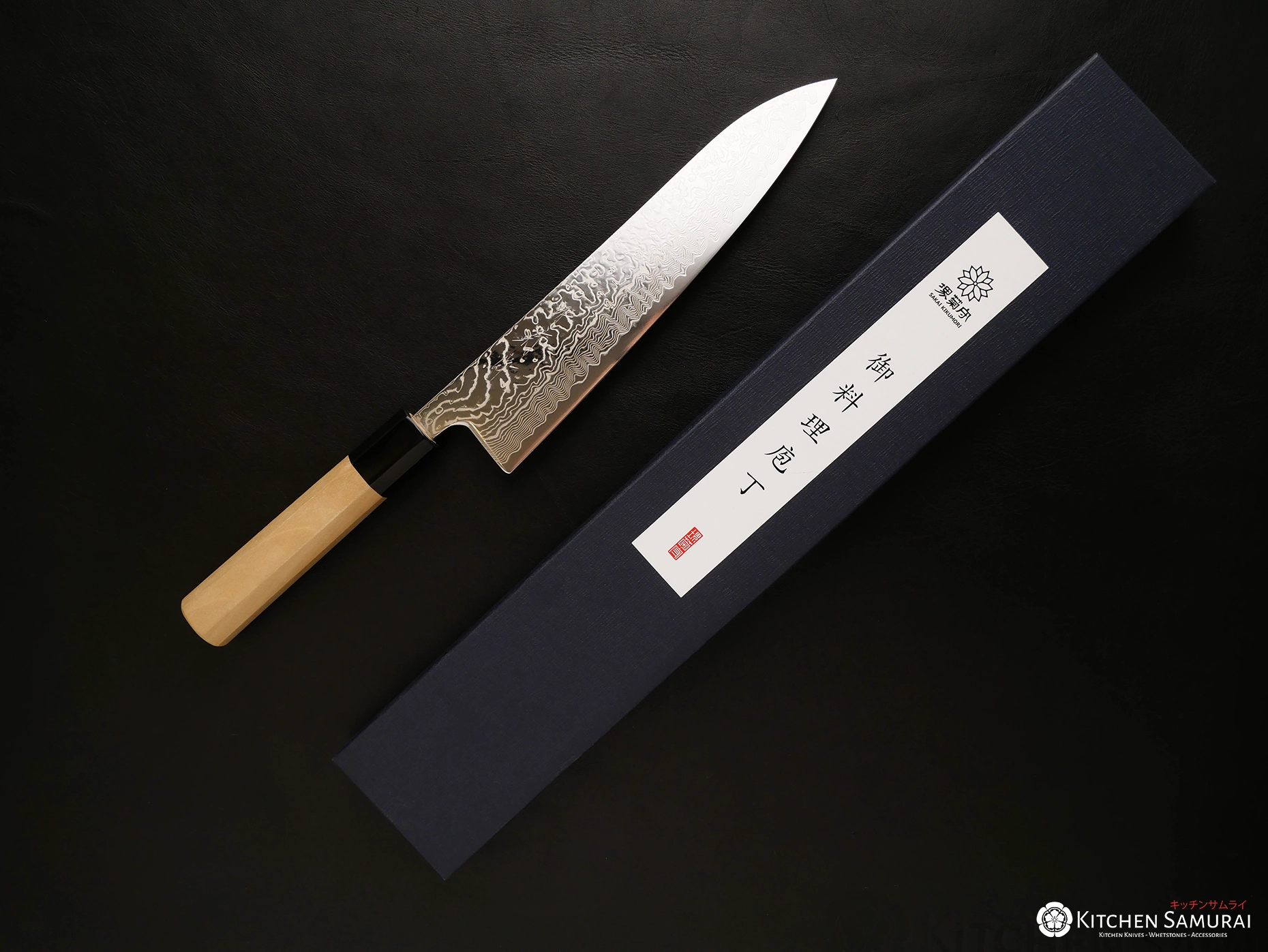 Gyuto (Chef’s) Knife (牛刀包丁 – pronounced: Gyūtō Bōchō) literally translated from Japanese means ‘Cow Blade’. ‘Gyu’ means Cow and ‘to’ means blade. The name stems from its original use to slice and disjoint large cuts of beef. These days the Gyuto is comparable to the Western-styled chef knife and is viewed as an all-rounder in the kitchen.