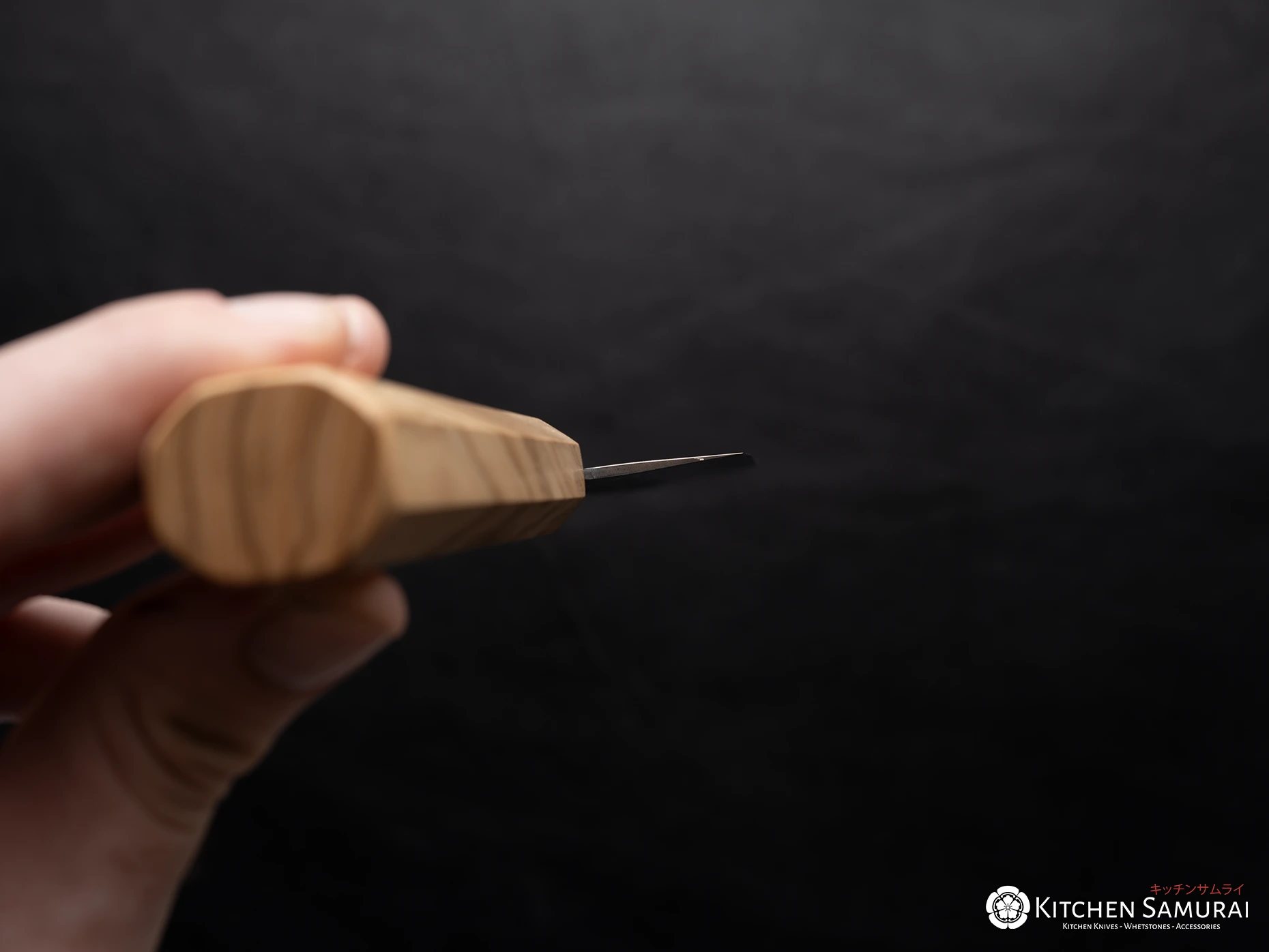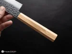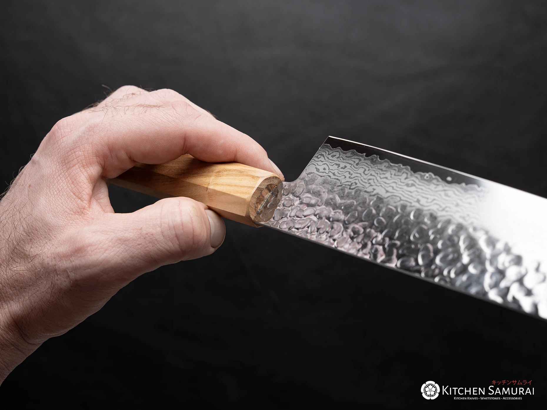 The Gyuto features a longer blade providing versatility for cutting larger produce while the tip of the blade allows it to be nimble enough for precision work. The edge is flat from the heel to the belly with a slightly rounded profile from the belly to the tip. The hard steel used in manufacturing makes the double-bevel edge much sharper than Western chef’s knives and retains the ultra-sharp edge for much longer.