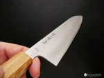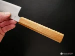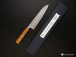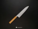 The Gyuto features a longer blade providing versatility for cutting larger produce while the tip of the blade allows it to be nimble enough for precision work. The edge is flat from the heel to the belly with a slightly rounded profile from the belly to the tip. The hard steel used in manufacturing makes the double-bevel edge much sharper than Western chef’s knives and retains the ultra-sharp edge for much longer.