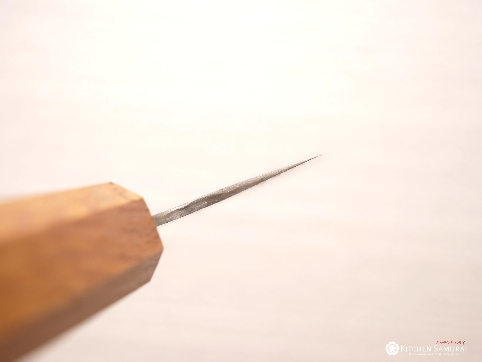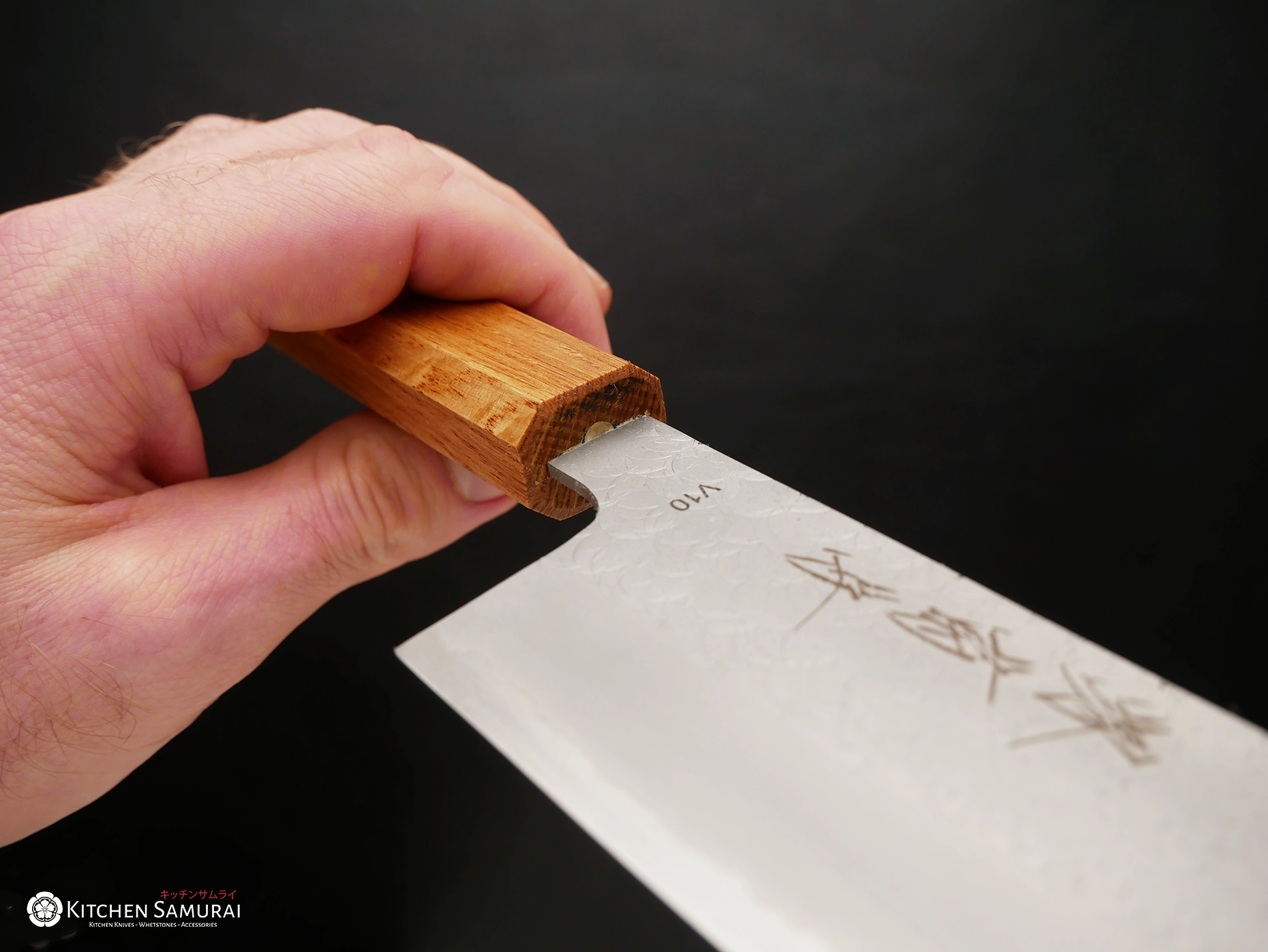 Most Japanese knives are made with much harder steel than their Western counterparts. Harder steel can be sharpened much sharper and hold an edge for long periods. Never cut through bones, frozen foods, butternut stems, lemongrass, etc. This can result in a chipped blade. Hard steel is much more delicate than softer steel.