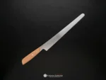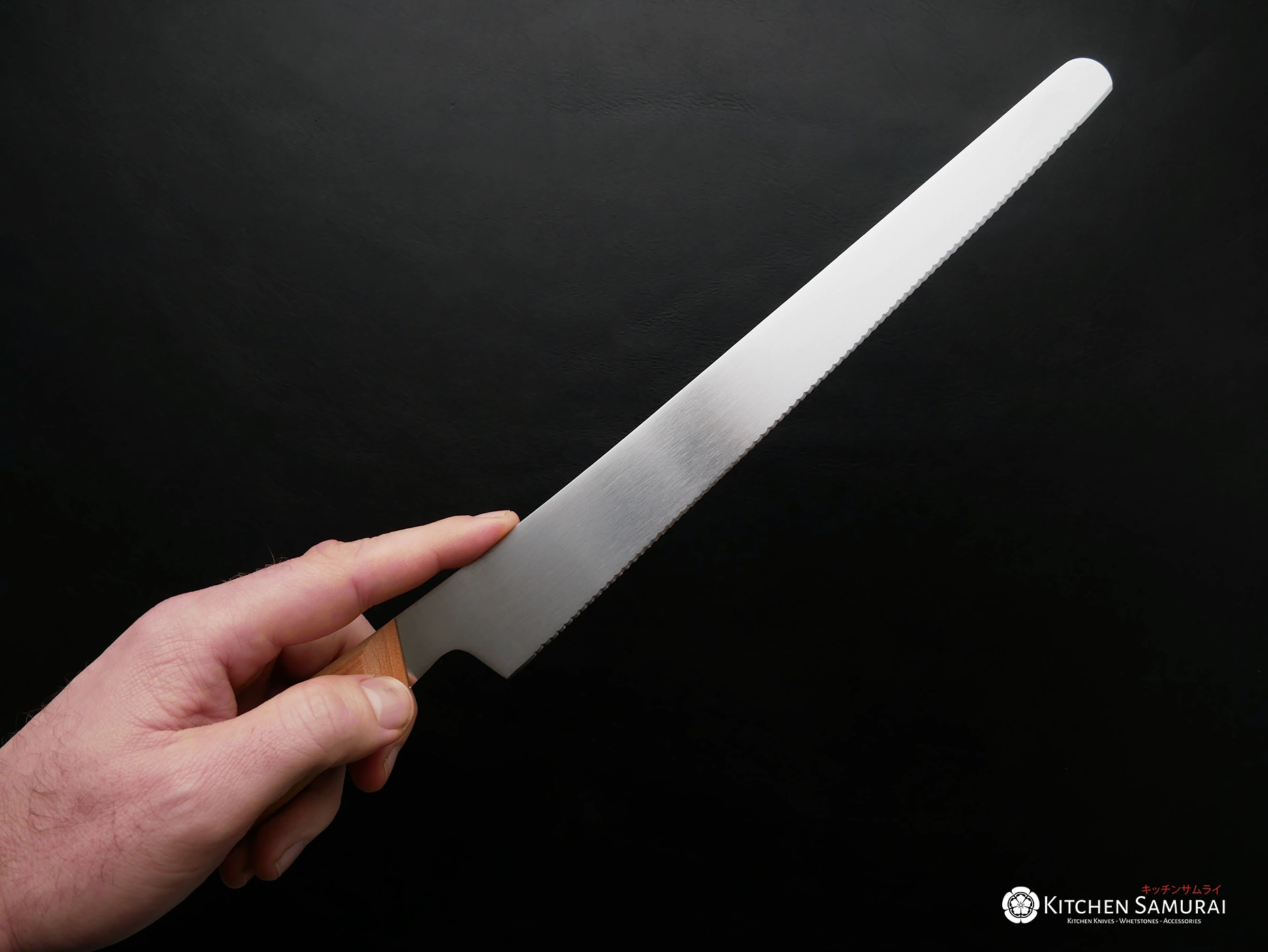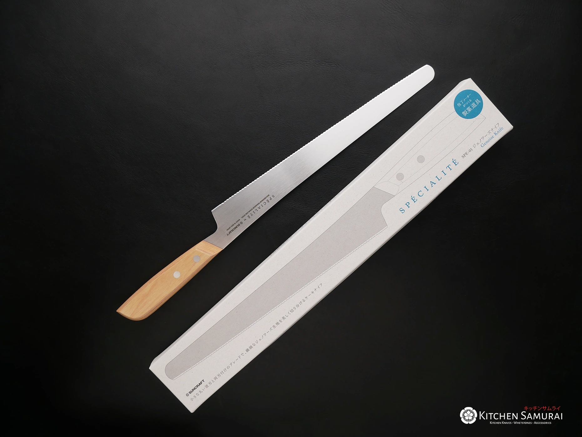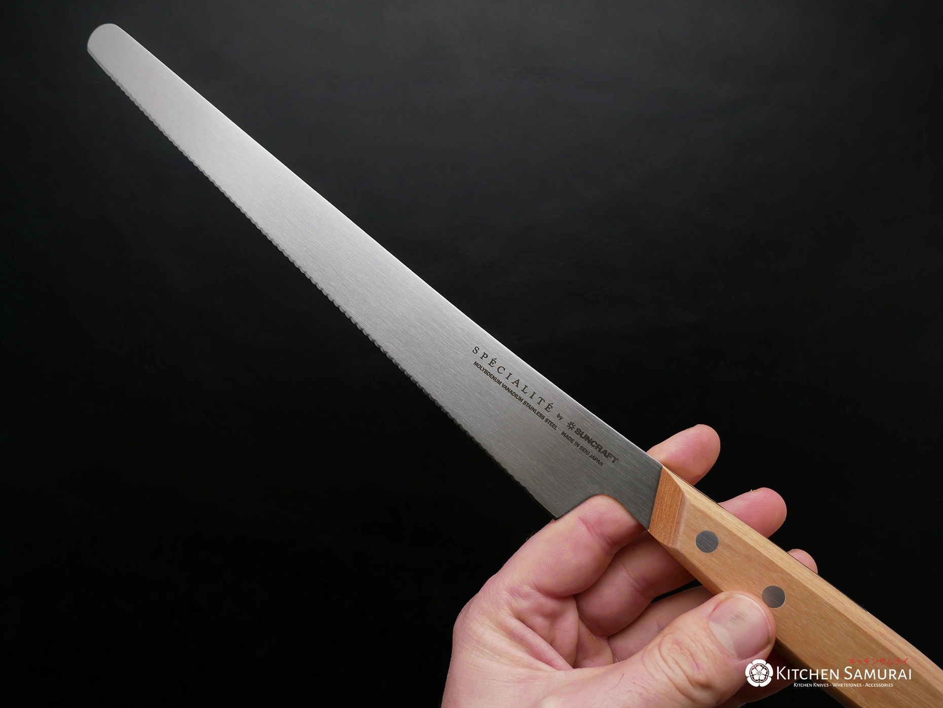 The Suncraft Genoise Knife is a specialized Japanese kitchen knife designed for precision slicing of delicate sponge cakes, genoise, and other soft baked goods. Crafted in Seki City, Japan, it features a 260mm stainless steel blade with a scalloped, serrated edge that glides effortlessly through airy textures without crushing the crumb. The ergonomic Pakkawood handle ensures a comfortable grip and durability. Ideal for bakers seeking clean, precise cuts, this knife combines traditional craftsmanship with modern functionality. Hand-wash recommended for optimal care.