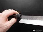The Gyuto features a longer blade providing versatility for cutting larger produce while the tip of the blade allows it to be nimble enough for precision work. The edge is flat from the heel to the belly with a slightly rounded profile from the belly to the tip. The hard steel used in manufacturing makes the double-bevel edge much sharper than Western chef’s knives and retains the ultra-sharp edge for much longer.