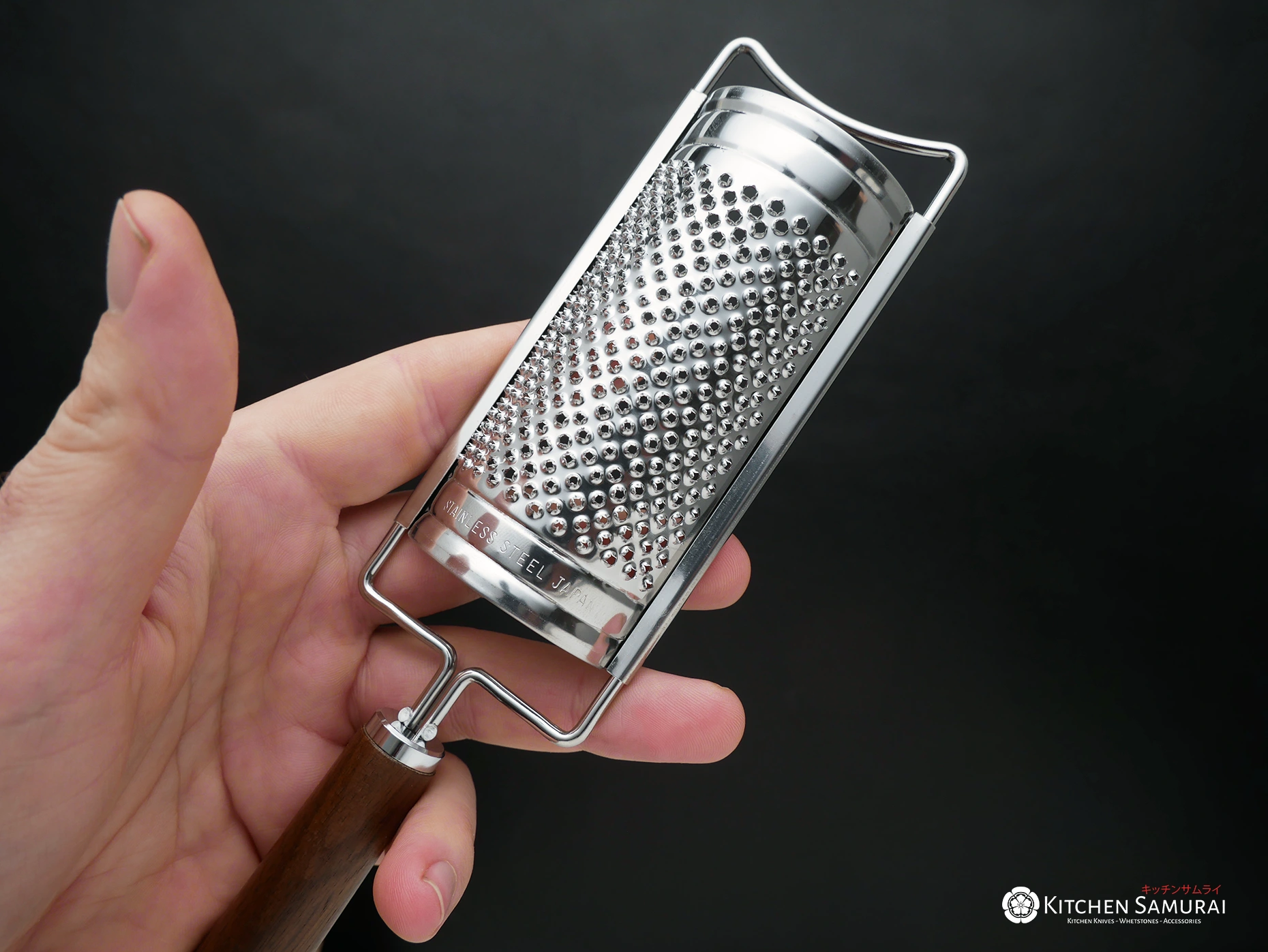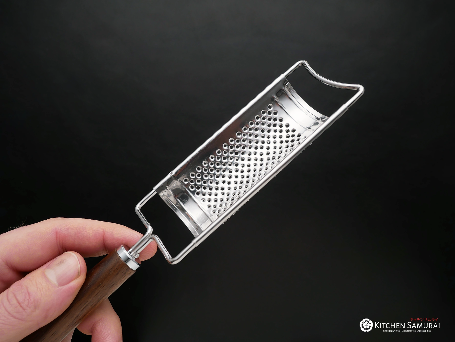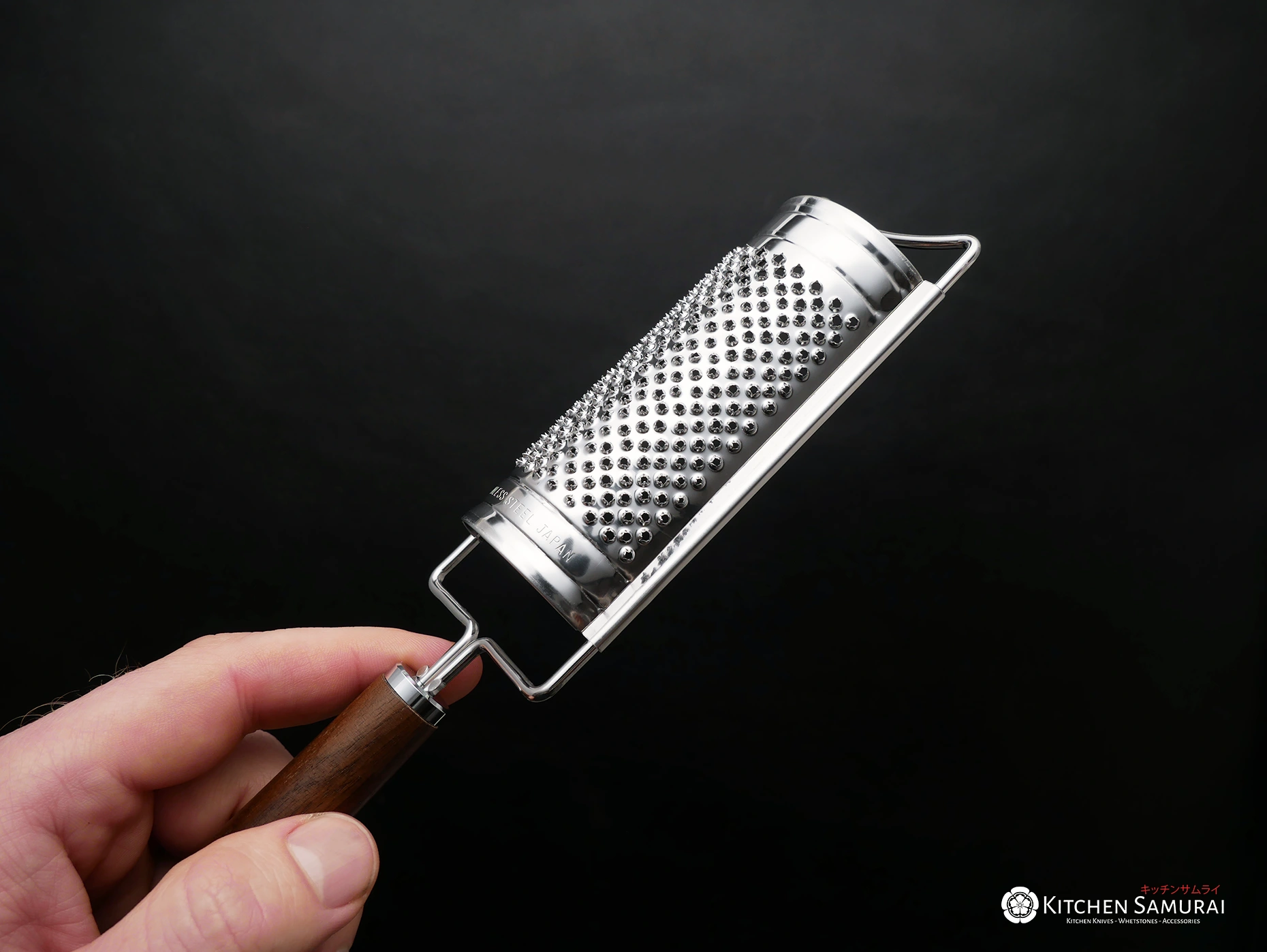 The Suncraft Woody Time Cheese Grater (WT-20) is a premium kitchen tool crafted in Seki City, Japan, designed for grating hard and semi-hard cheeses with ease. Featuring ultra-sharp stainless steel blades, it delivers precise, fluffy textures for cheese, ginger, garlic, and more. The elegant walnut wooden handle, offers a comfortable, ergonomic grip, while its sleek design enhances kitchen aesthetics. Durable and easy to clean, this grater is perfect for cheese lovers and culinary enthusiasts. Hand-wash recommended for optimal care.