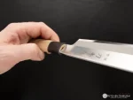The Yanagiba’s long, thin and narrow blade allows the user to cut through a fish fillet using just one single long stroke instead of back and forth “sawing”. The weight of the blade is enough to ensure minimum pressure while slicing fresh fish fillets. The Yanagiba has a single-bevel edge allowing it to be extremely sharp. Traditional Japanese knives characteristically have single-bevel edges. Most single-bevel knives are right-handed so if you are left-handed make sure to request.