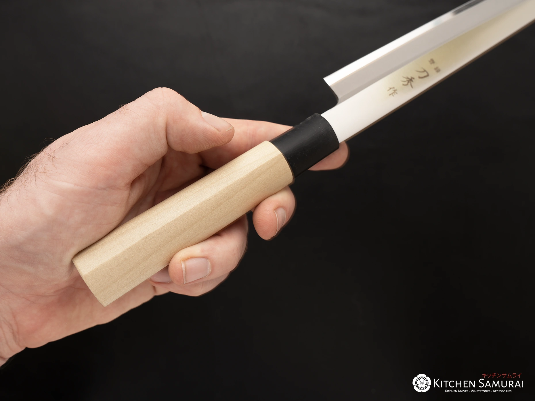 The Yanagiba knife is best for slicing raw fish, especially for the preparation of sashimi and nigiri sushi dishes. The thinness and length of the blade profile allow for Japanese pull-cutting techniques. The sharpness of the blade makes it possible to do so in one clean sweep preventing tearing or bruising of the fish. The cut surfaces stay smooth, fresh, shiny and deliver delicate flavours and soft textures.