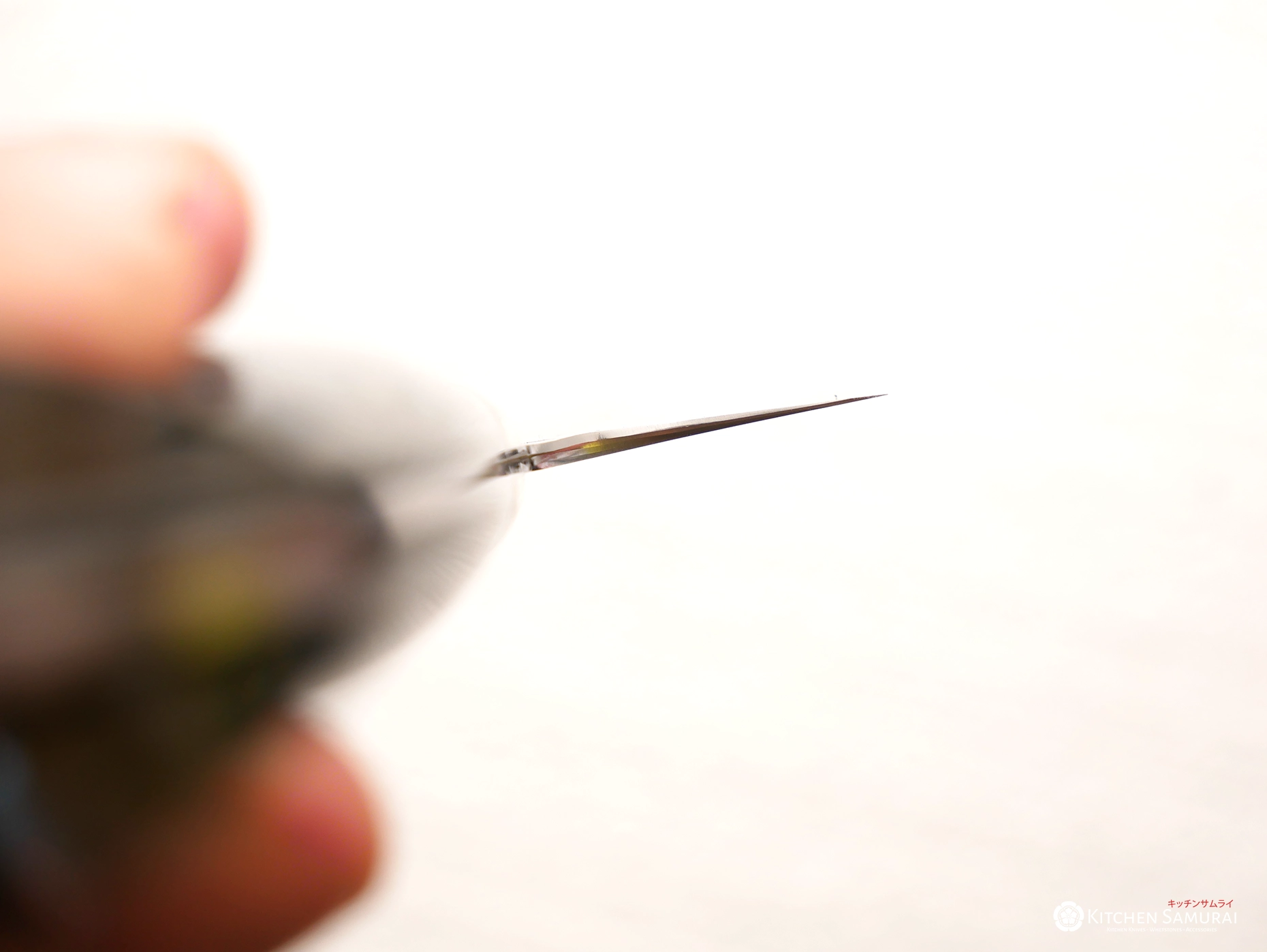 Most Japanese knives are made with a much harder steel than their Western counterparts. Harder steel can be sharpened much sharper and hold an edge for long periods. Never cut through bones, frozen foods, butternut stems, lemongrass, etc. This can result in a chipped blade. Hard steel is much more delicate than softer steel.
