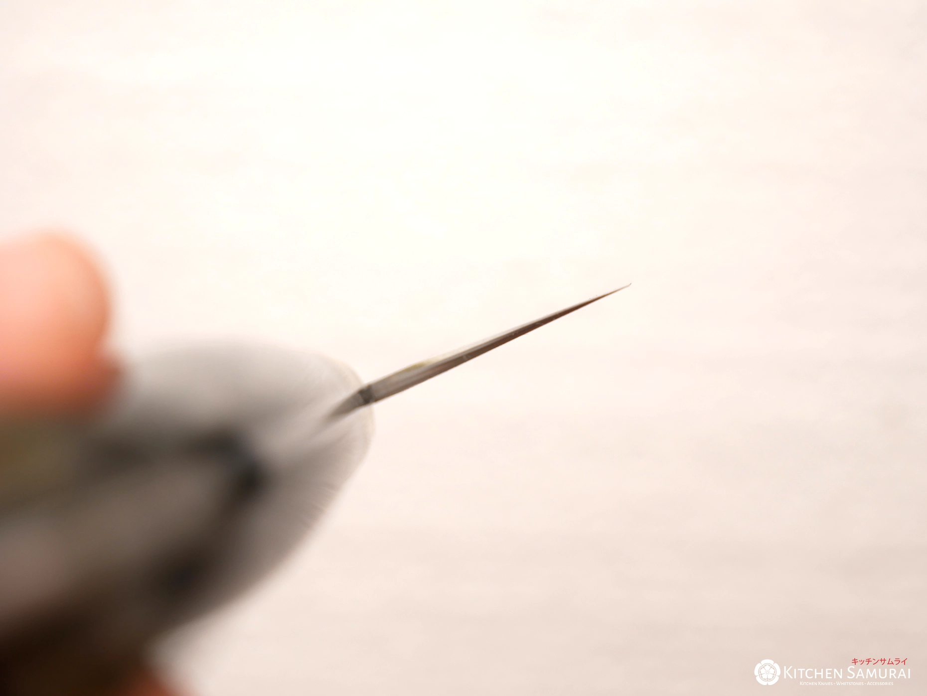 Most Japanese knives are made with a much harder steel than their Western counterparts. Harder steel can be sharpened much sharper and hold an edge for long periods. Never cut through bones, frozen foods, butternut stems, lemongrass, etc. This can result in a chipped blade. Hard steel is much more delicate than softer steel.